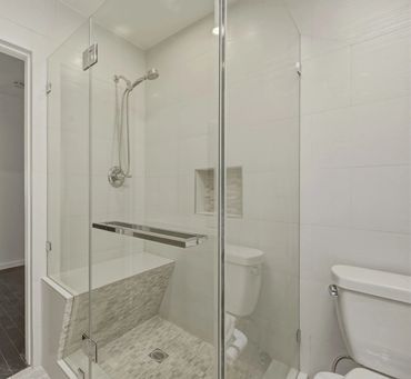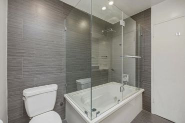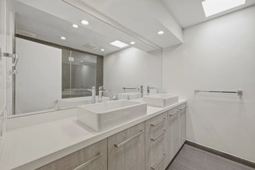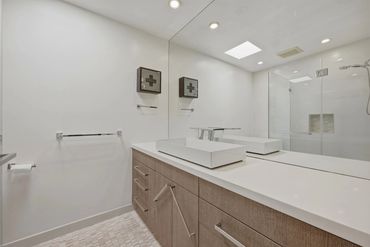 contemporary finishes, including skylights. There is a glass-enclosed shower /tub and double vanity in the second bathroom.