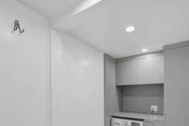 approved combo washer / dryer in the unit that is located in a laundry room with additional storage.